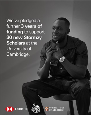 Five years since the launch of the Stormzy Scholarship programme at the University of Cambridge, HSBC UK has pledged a further £2m in support of 30 new Stormzy Scholarships over the next three years (2024-26). The #Merky Foundation, the UK charity founded by the award winning British musician, Stormzy, will continue to fund a further two students per year.1,2